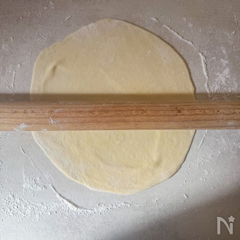 (4) 作業台に打ち粉をふり、3の生地をめん棒で円形に伸ばす。