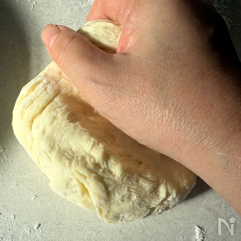 生地がしっとりとまとまり、手でこねると伸びるようになるまで、数分間こねる。