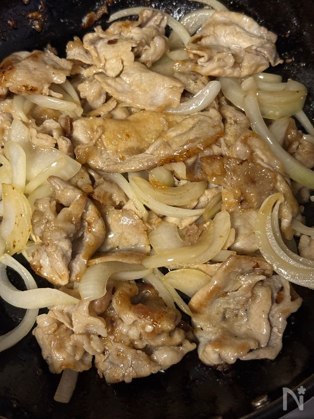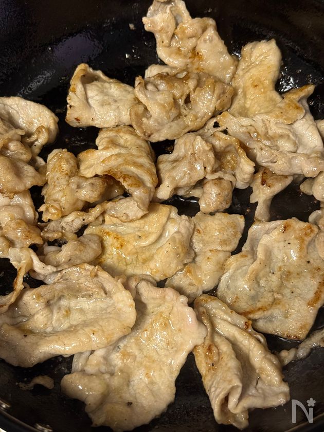 (3) ごま油をひいて熱したフライパンに豚ロース薄切りを焼き色がつくように中火で両面さっと焼く。