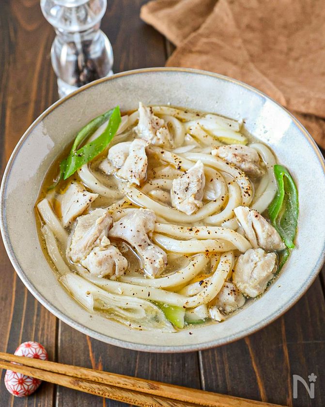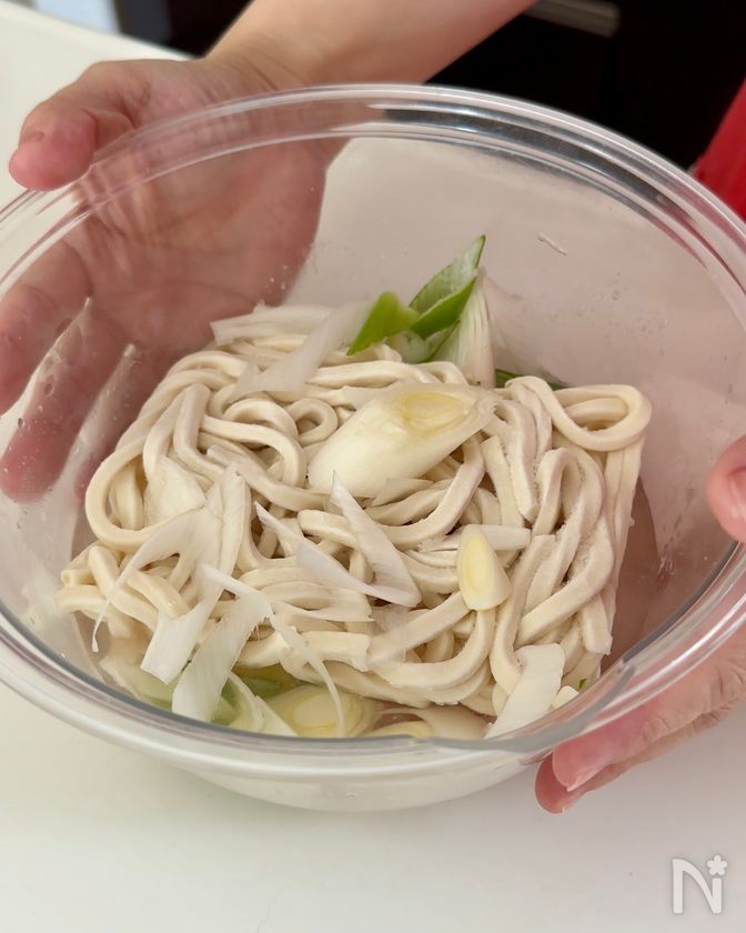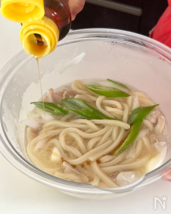 (3) 耐熱容器に鶏肉、冷凍うどん、長ねぎの順に入れて電子レンジで(600W)、5分30秒加熱する。