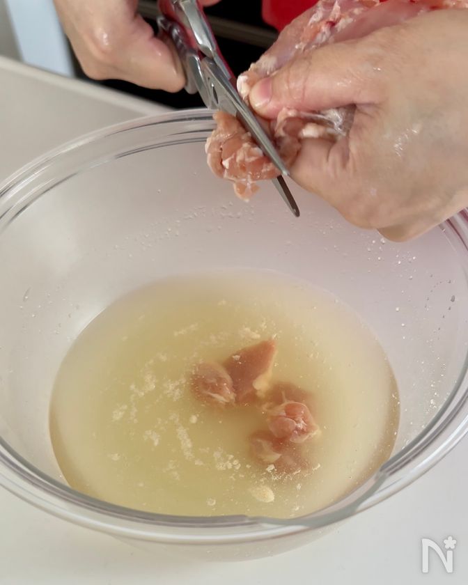 (2) 鶏もも肉はキッチンバサミでひと口大に切る。長ねぎはキッチンバサミで斜め切りにする。