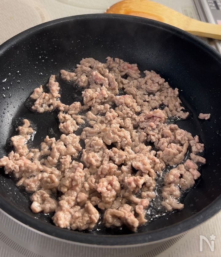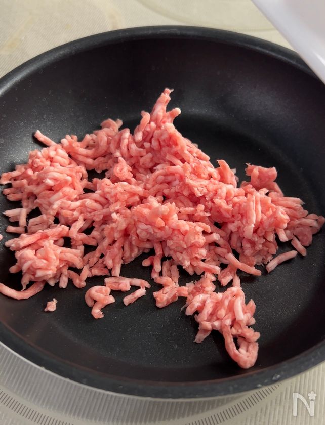 (1) フライパンに豚ひき肉を入れて、中火にかける。