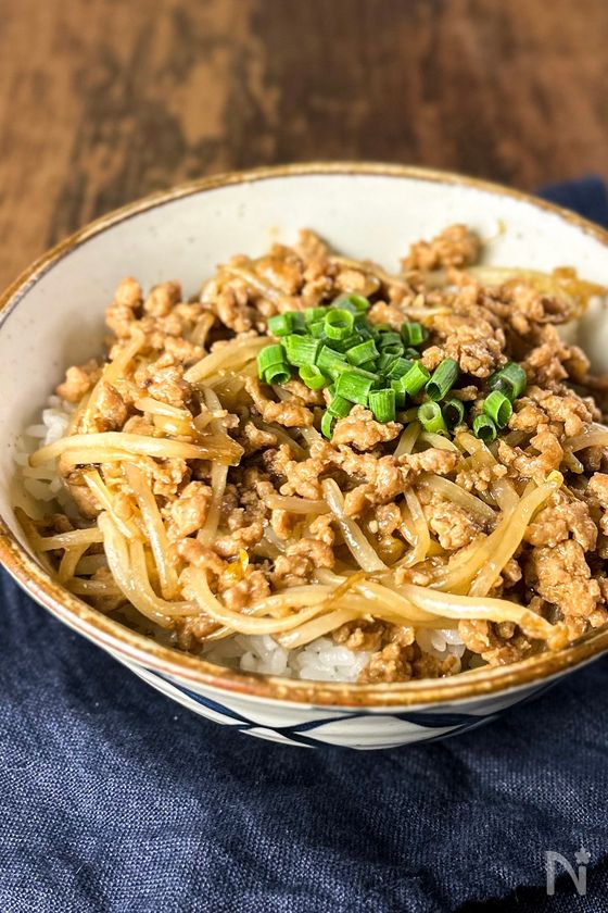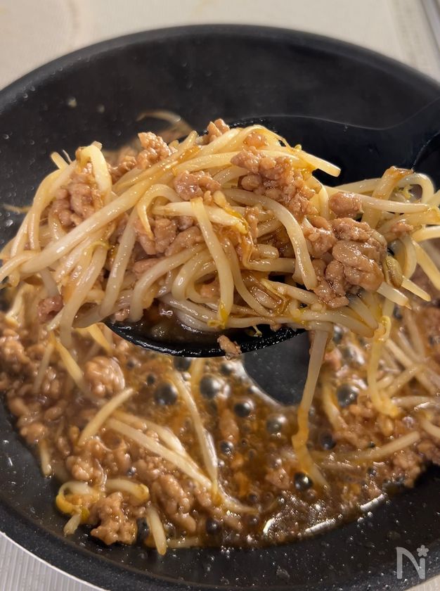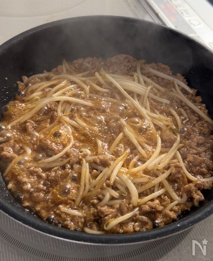 (2) 肉の色が変わったら、【A】ともやしを入れる。