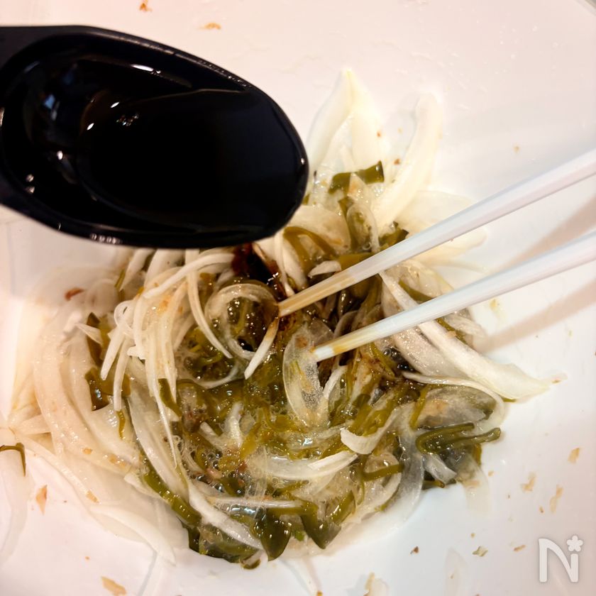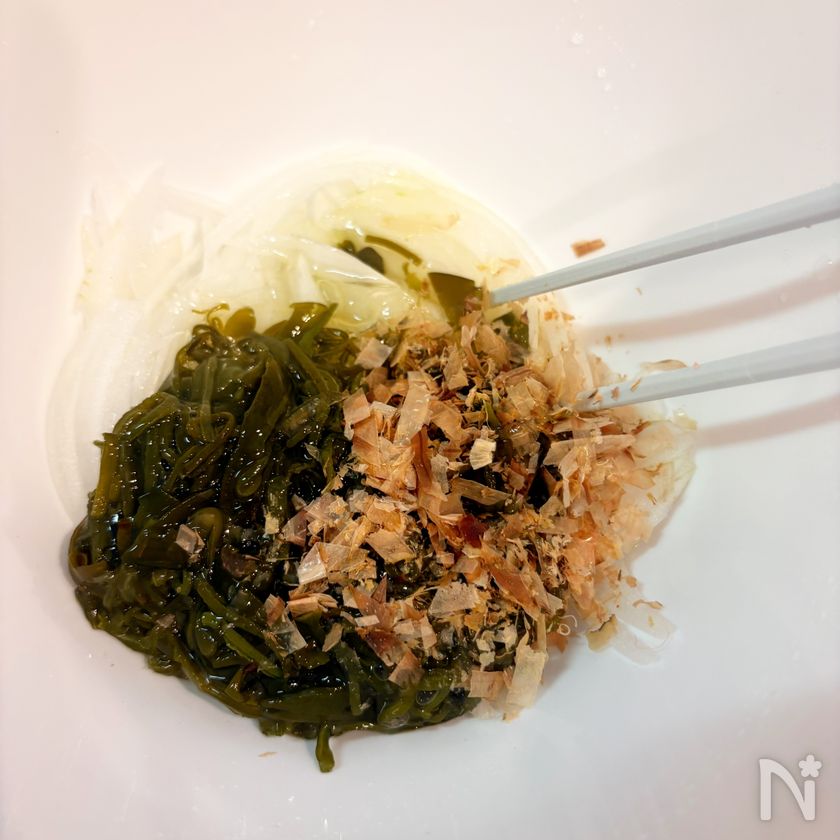 (2) ボールに新玉ねぎ、味付けめかぶ、かつお節を入れよく混ぜる。