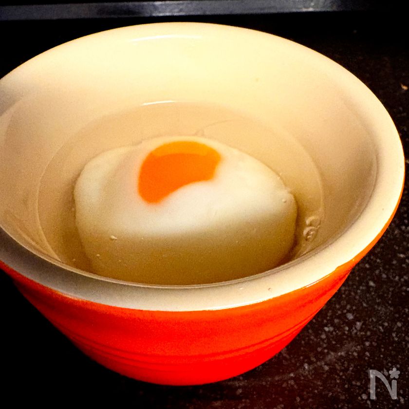 水(大さじ3)を入れ電子レンジ500wで1分加熱し温泉卵を作る。