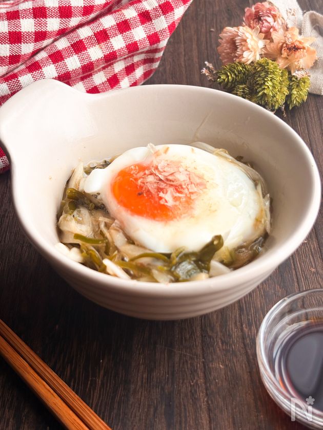 (4) 器に盛りつけ中央に温泉卵、かつお節を飾る。