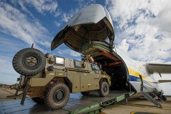 An-124で輸送される「ブッシュマスター」装甲車(画像:オーストラリア国防省)。