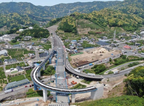 現場は、土工から擁壁工、橋桁の架設、電気設備、トンネル照明など、全部で28工区が同時進行となっています。工事区間にある3本のトンネルはすでに貫通済みで、のこる大きな工事は、高架橋の橋桁製作と架設となっており、あとは切土部分が着手され、全体としては「工事後半」の段階に入っています。