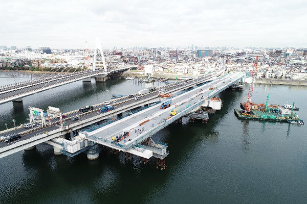 架け替え準備が進む高速大師橋。既存の橋桁の横に新しい橋桁が(画像:首都高速道路)。