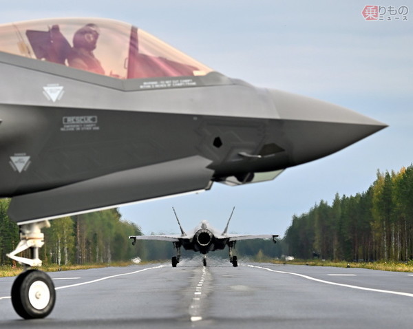 フィンランド国内の高速道路で離着陸訓練を行うノルウェー空軍のF-35A戦闘機(画像:フィンランド空軍)。