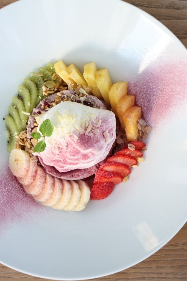 商品名:「幸せのアサイーボウルパフェ」特徴:自家製ジェラートと合わせたスーパーフード「アサイー」とフレッシュなフルーツ、ヨーグルト、ホイップクリームを組み合わせた贅沢なパフェ