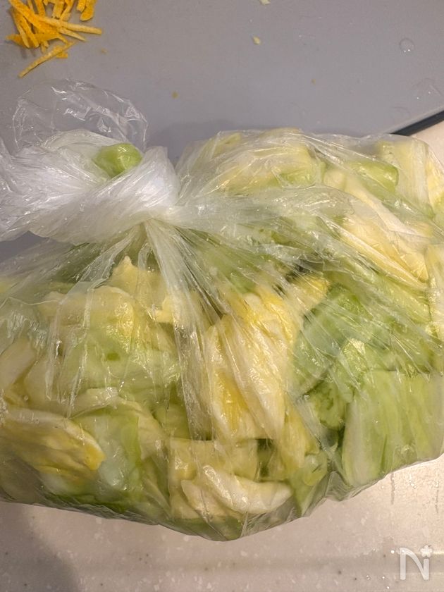 (3) ポリ袋にキャベツと塩を入れしっかりと口を閉めたら軽く揉んで冷蔵庫で30分~1時間置く。