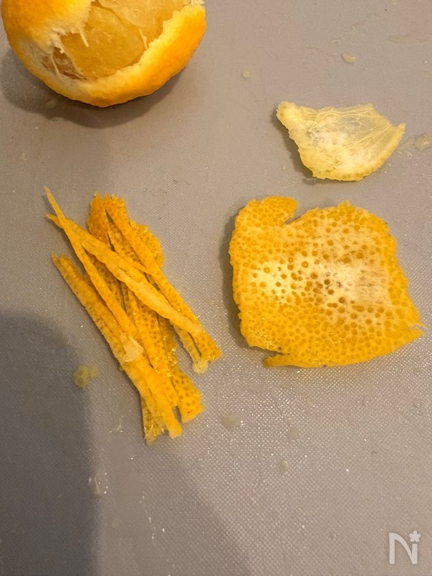 (2) ゆずの皮を剥き、白い部分は削ぎ取る。