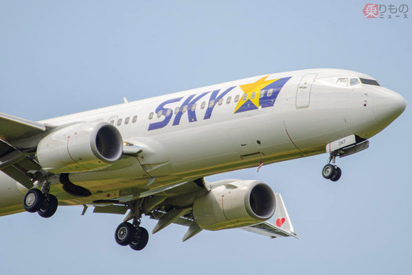 着陸するボーイング737旅客機(咲村珠樹撮影)。
