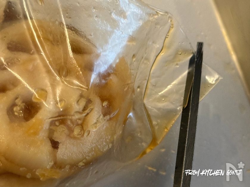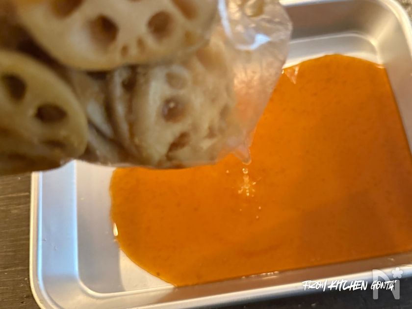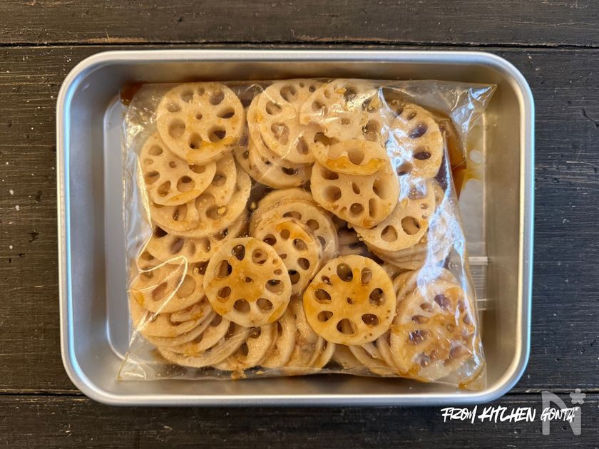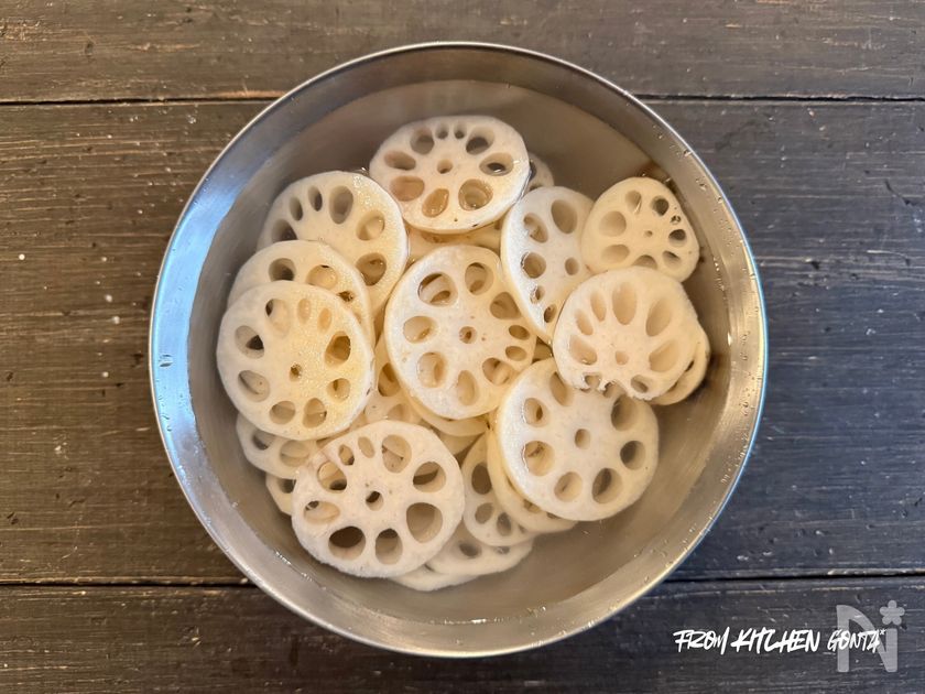 (1) れんこんの皮を剥いたあと、8mmほどの輪切りし、酢水に10分ほどつけておく。