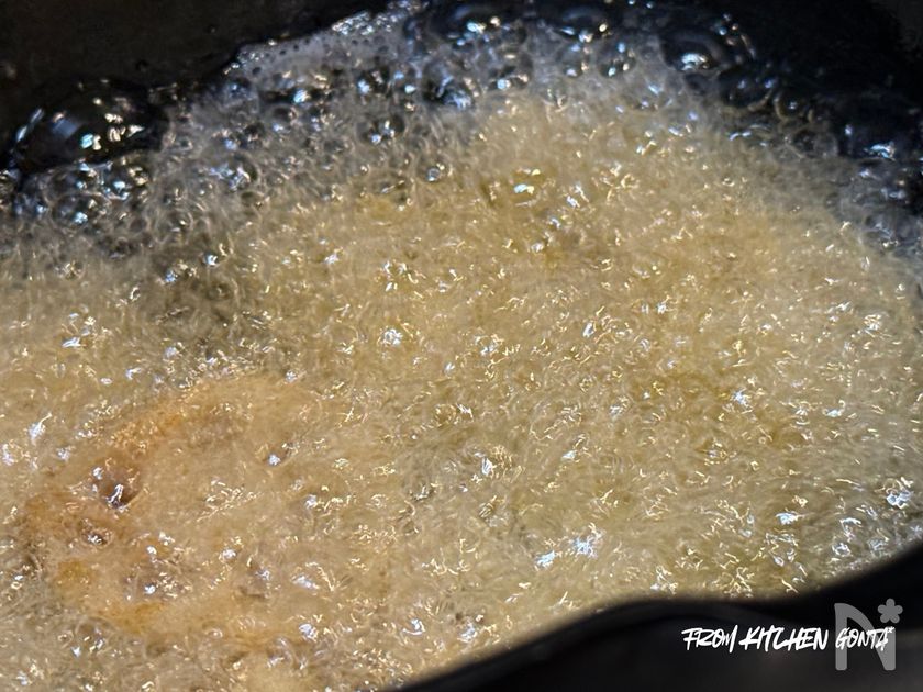 (7) 170度に熱しておいた揚げ油で、お好みの加減まで揚げる。