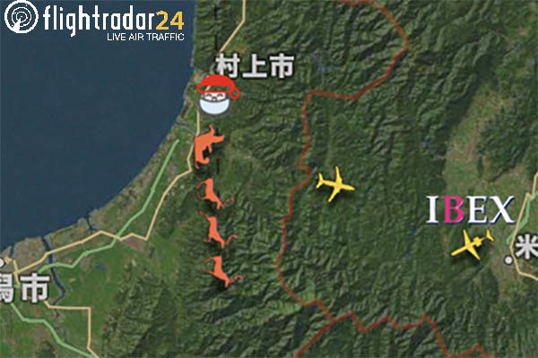 世界で飛んでいる多くの航空機をほぼリアルタイムで追えるサイト「フライトレーダー24」上で、クリスマスの時期に出現した「サンタの機影」。この機影が、2021年12月24日(金)の13時ごろに、日本上空を通過しています。