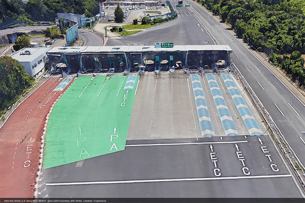 保土ヶ谷料金所。IC出口、PA、本線とレーンごとに3つの機能がある(画像:Google)。