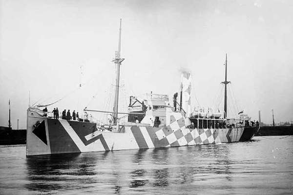 イギリスが建造した「Qシップ」。幾何学的な塗装はわざと距離を見誤せるための欺瞞塗装(画像:IWM)。
