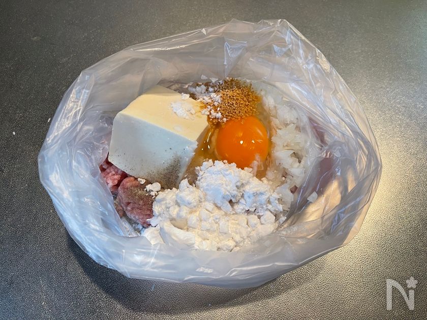 (1) ポリ袋に、豚ひき肉、豆腐、玉ねぎ、【A】を入れて、もみこみ、成形する。(ハンバーグの厚さは1.5cmにする)