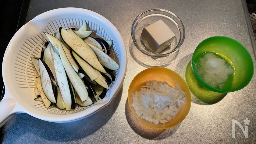 (下準備) ・なすは、タテ半分に切り、薄く斜め切りにする。