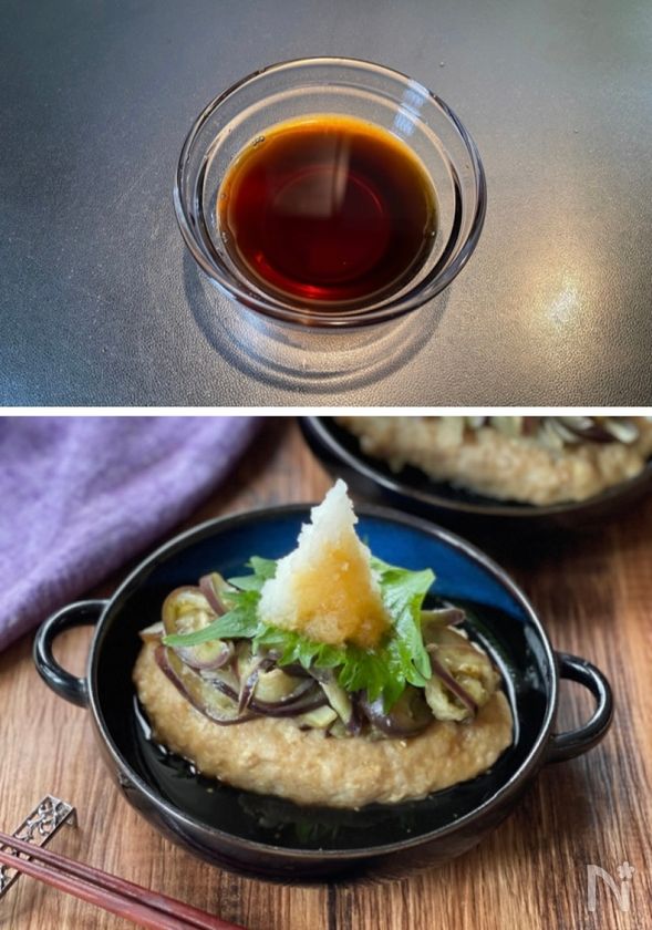 (3) 【B】を合わせ、お皿に、ハンバーグ、なす、大葉、大根おろしを盛り付け、合わせたタレをかける。