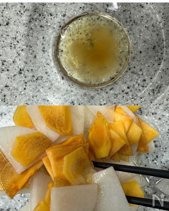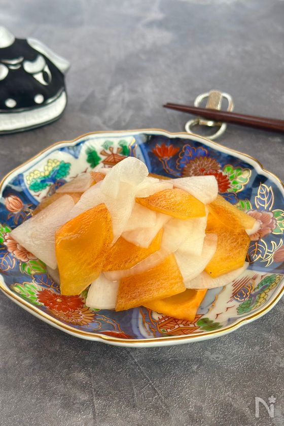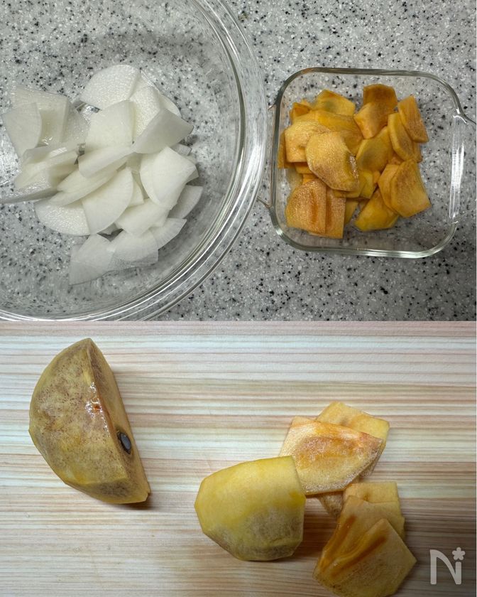 (1) 大根は皮をむき、厚さ2〜3mmのいちょう切りにしたらボウルに入れ、塩小さじ1/4をふって軽くもみ、10分おいて水気をしっかり絞る。柿はヘタを落とし皮をむき、半分に切ったら2〜3mmの薄切りにする。