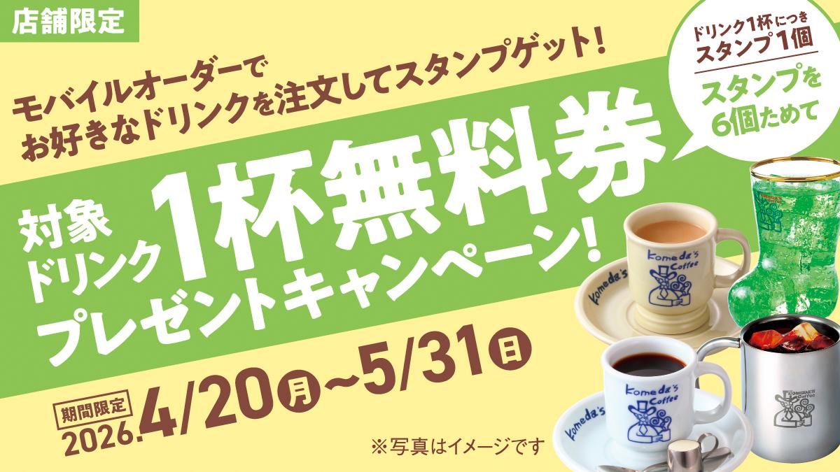コメダ珈琲店は、2026年5月31日までの期間限定で、キャンペーン対象店舗にてコメダ公式アプリのモバイルオーダーから好きなドリンクを注文するとドリンク1杯につきアプリへスタンプが1つもらえます。