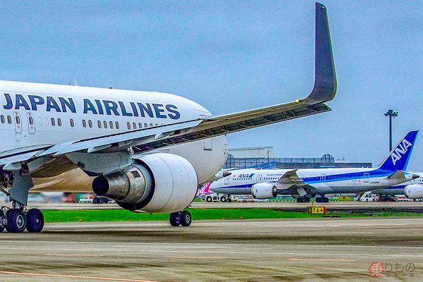 JALとANAの飛行機(2020年、乗りものニュース編集部撮影)。
