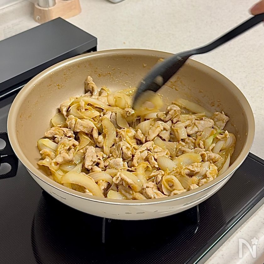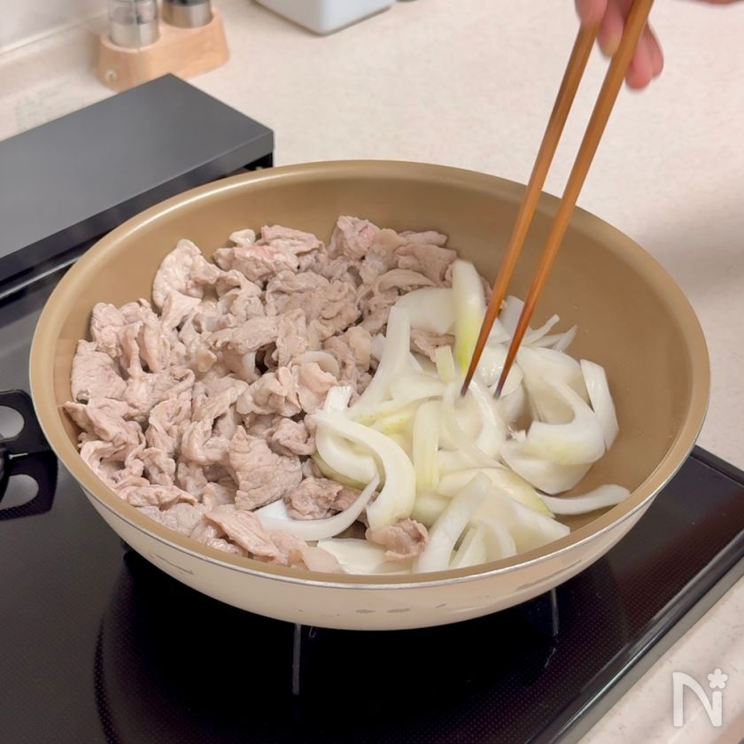 (3) 豚肉に火が通ったらフライパンの隅に寄せ、新玉ねぎをさっと炒める。