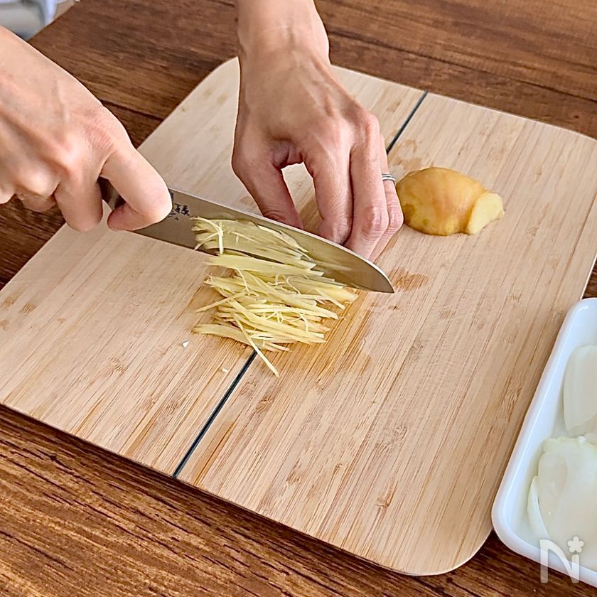 (1) 玉ねぎは縦半分に切り、繊維に沿って薄切りに、生姜は半分をすりおろし、もう半分はせん切りにする。【A】とおろし生姜を合わせておく。