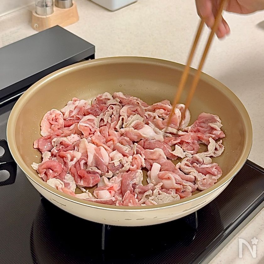 (2) フライパンを中火にかけサラダ油をひき、豚薄切り肉を広げながら並べる。裏返しながら両面を焼く。