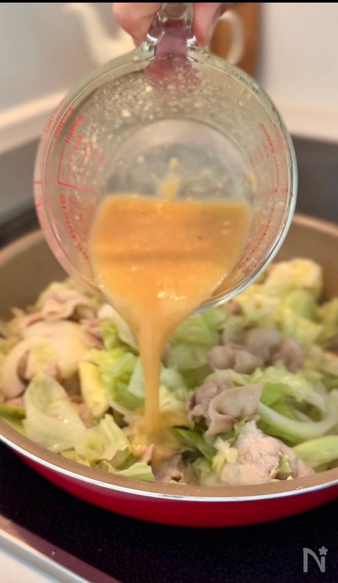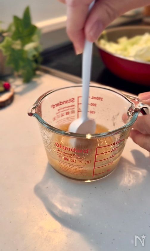 (4) キャベツがしんなりしてきたら、②をさっと混ぜて、Aのタレを加えて混ぜる。
