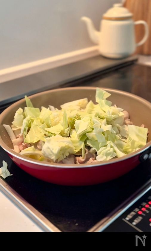 (2) フライパンにごま油をひき、豚バラ、玉ねぎを中火で炒める。豚バラ薄切り肉の色が変わってきたら、キャベツで蓋をするように上にのせる