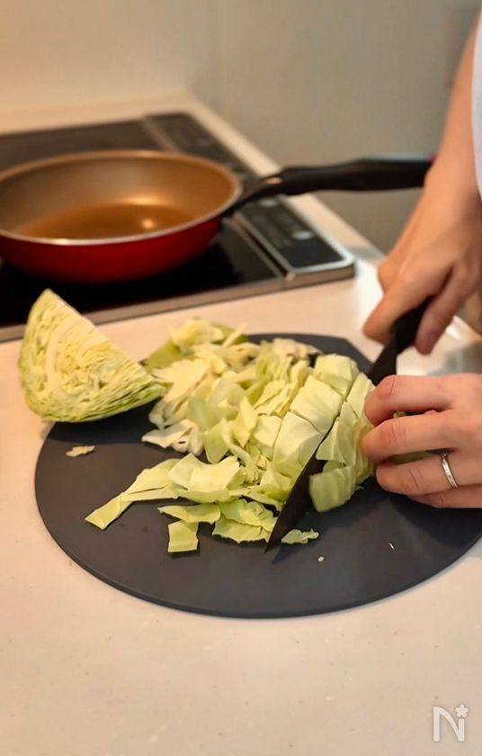 キャベツを入れたら、あまり触らず、ささっと混ぜる。シャキシャキ感が残って美味しいです!