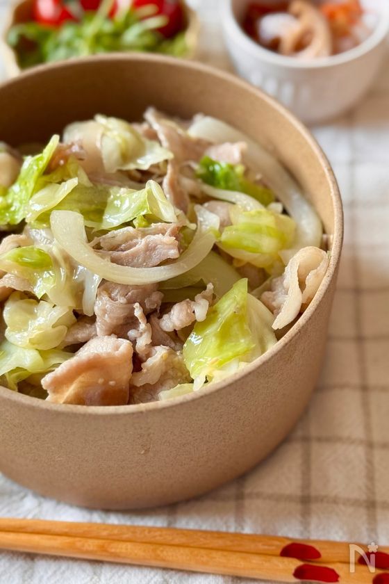 (1) キャベツは、ザク切りに、玉ねぎは5mm幅のくし切りにする。豚バラ薄切り肉は、食べやすい長さに切る。