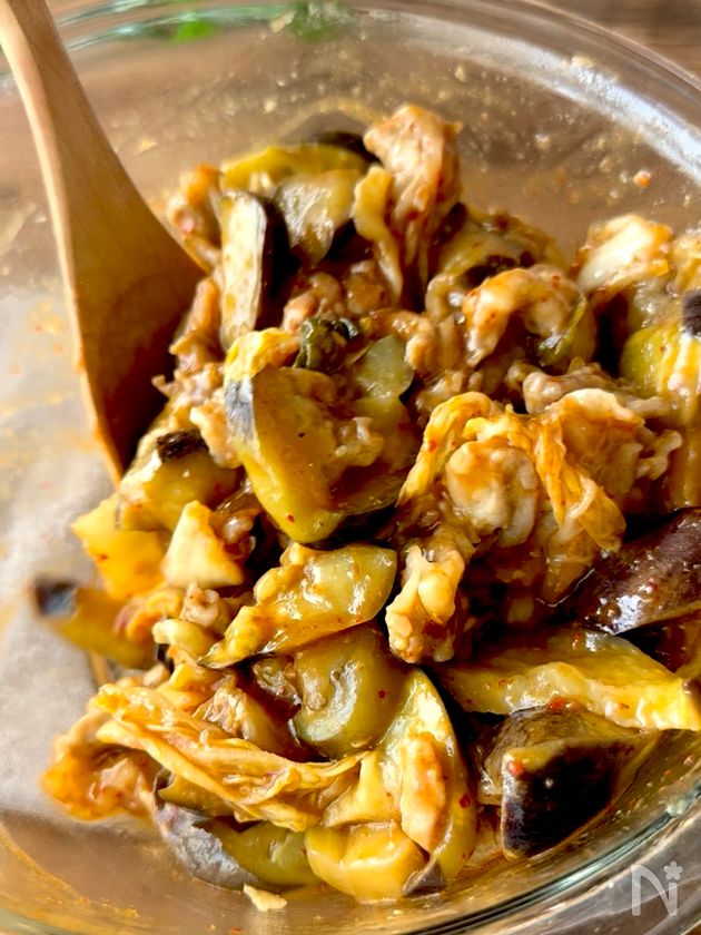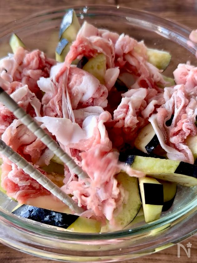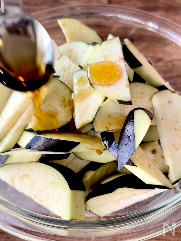 (2) なすと【A】をボウルに入れ、全体に油をからめる。