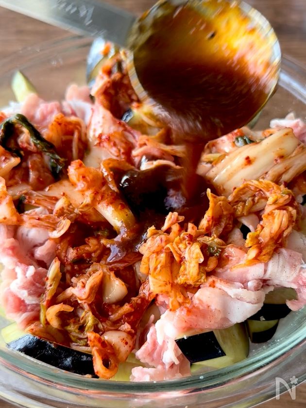 (4) さらにその上にキムチを広げ、焼肉のタレ(中辛)を回しかける。