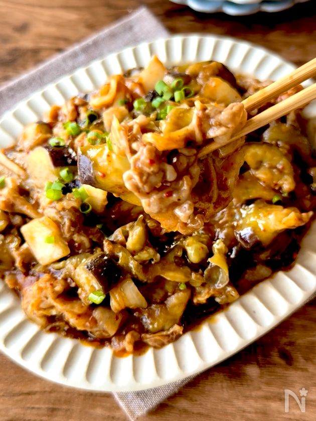 ◎ なすは皮をところどころむき、先に油をまぶすとトロトロに仕上がります。油はごま油とサラダ油を半々にし、香りが強くなりすぎないようにしています。