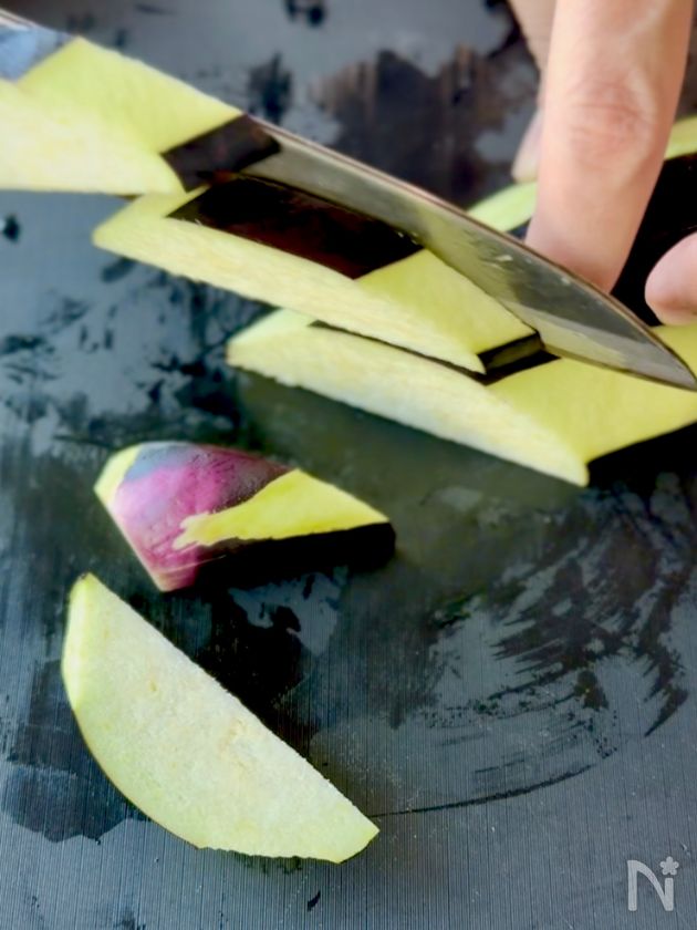 (1) なすは縦に3〜4カ所皮をむき、縦半分に切って5mm幅の斜め切りにする。