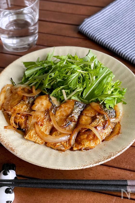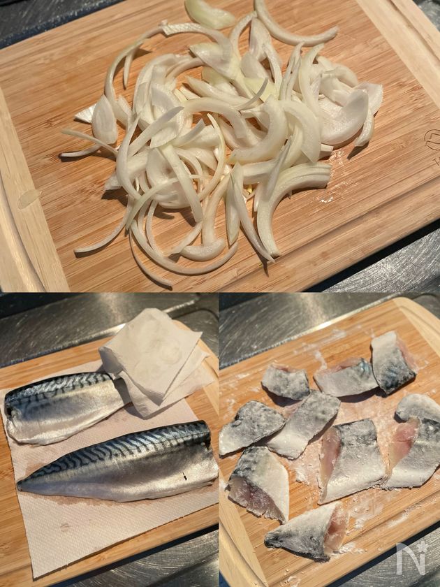 (1) 玉ねぎは繊維に沿って5mm幅に切る。骨取り塩サバは表面の水分をキッチンペーパーで拭き取り、食べやすい大きさに削ぎ切りにして片栗粉をまぶす。