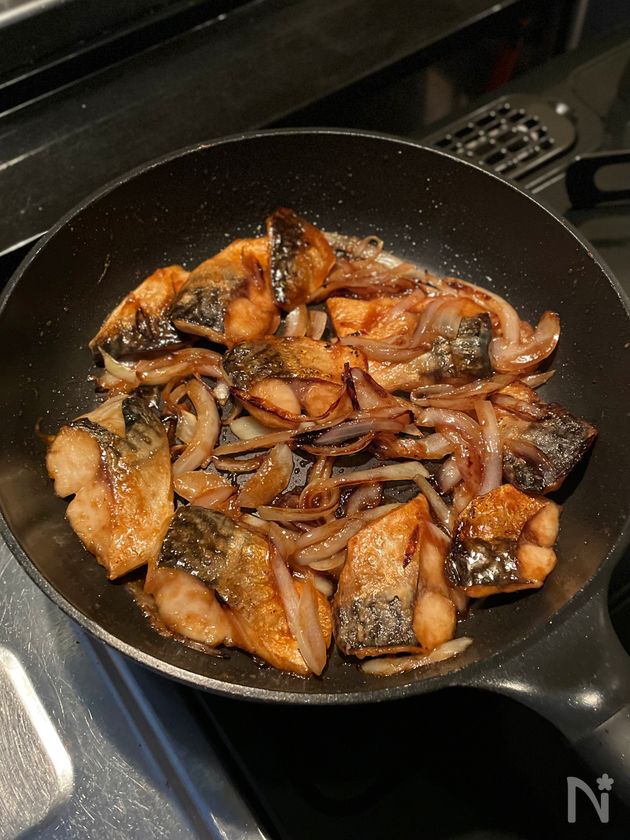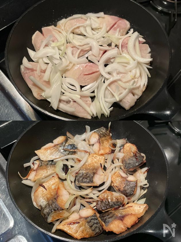 (2) ごま油を中火で熱し、サバを皮目から並べる。空いたスペースに玉ねぎを置いて、一緒に両面焼き色をつける。