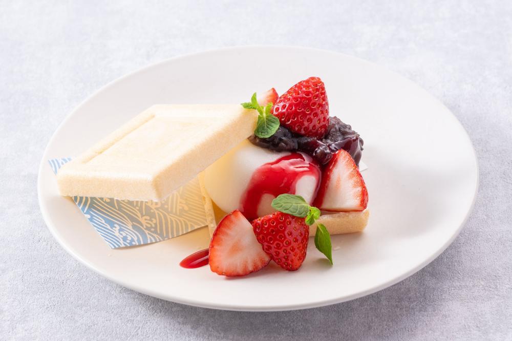 館内レストラン「シャルロッテ」でランチを注文すると、通常のランチメニューのデザートに代わり、「生雪見だいふく」を使用したデザート「生雪見だいふくと苺の最中仕立て~黒蜜添え~」が提供されます。