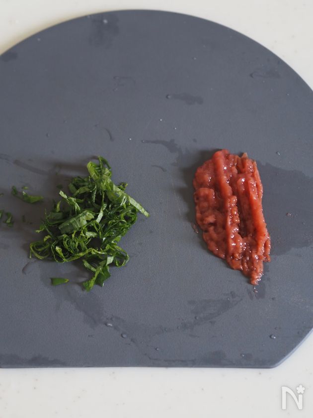 (2) 大葉は千切り、梅干しは種を取り除いて包丁で叩く。