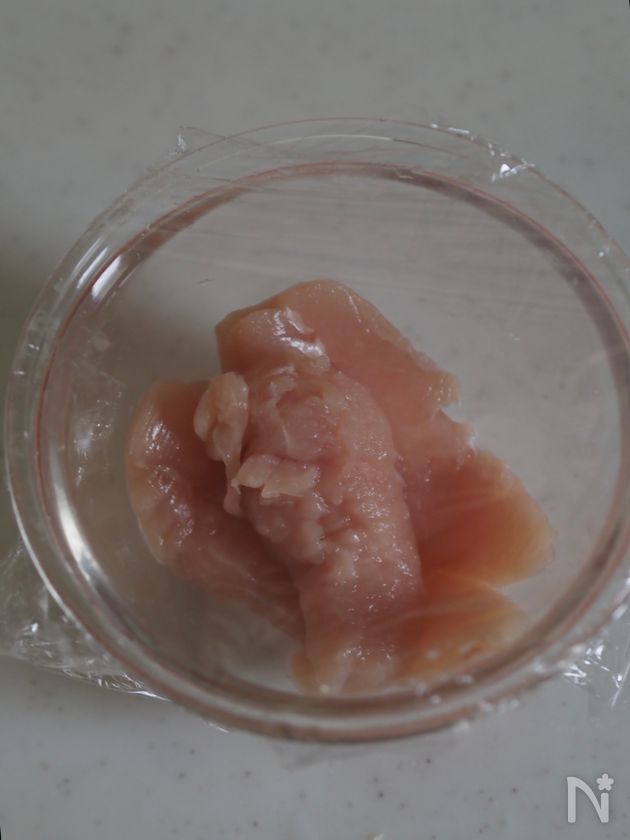 レンジ加熱した後のささみはとても熱いので、必ず粗熱を取ってからさいてください。