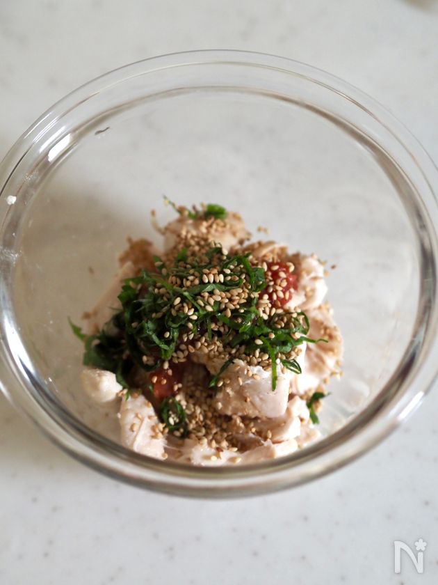 (3) ささみの粗熱が取れたら食べやすい大きさにさき、ボウルに入れる。