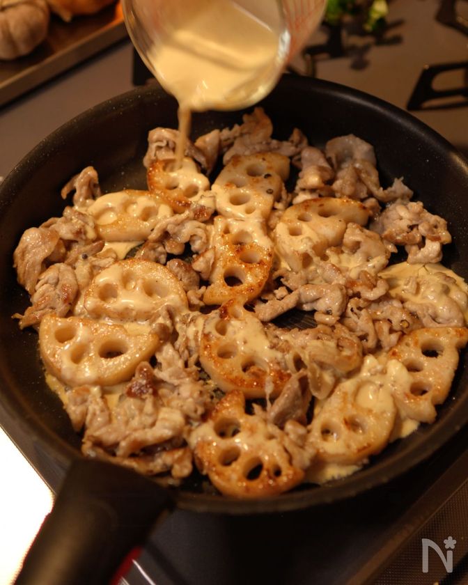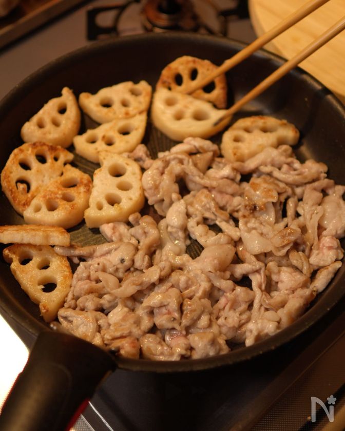 火が通ってきたら、豚肉の肉汁をれんこんに絡めながら焼く。