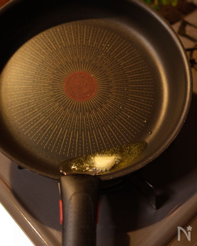 (3) フライパンにオリーブオイルとにんにくを入れ、中火にかけて香りを立たせる。