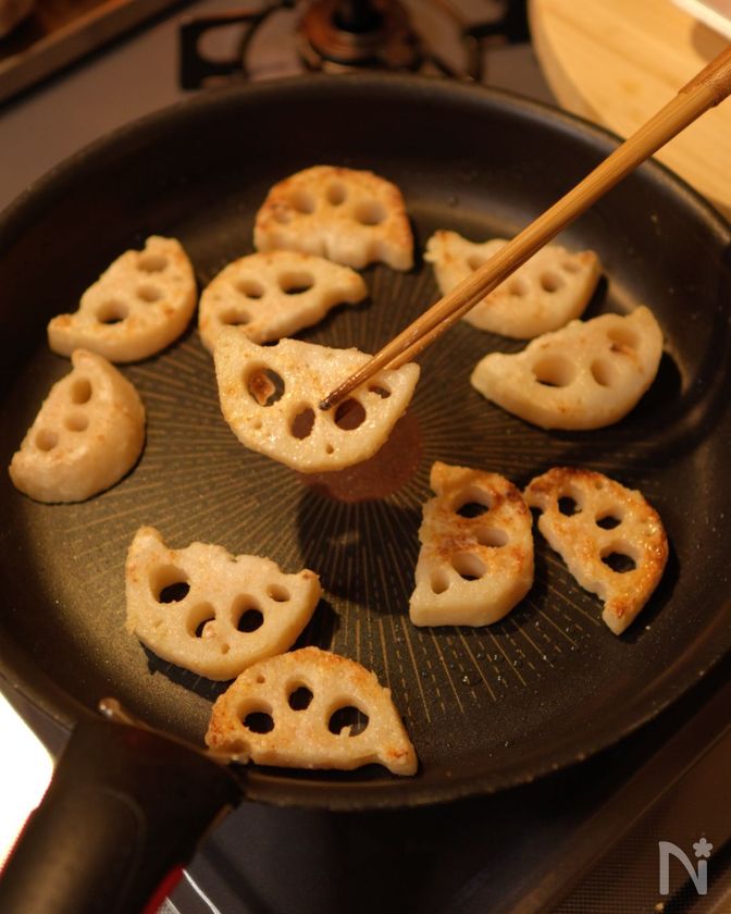 (6) 蓮根を裏返し、両面に軽く焼き色がつくまで焼く。