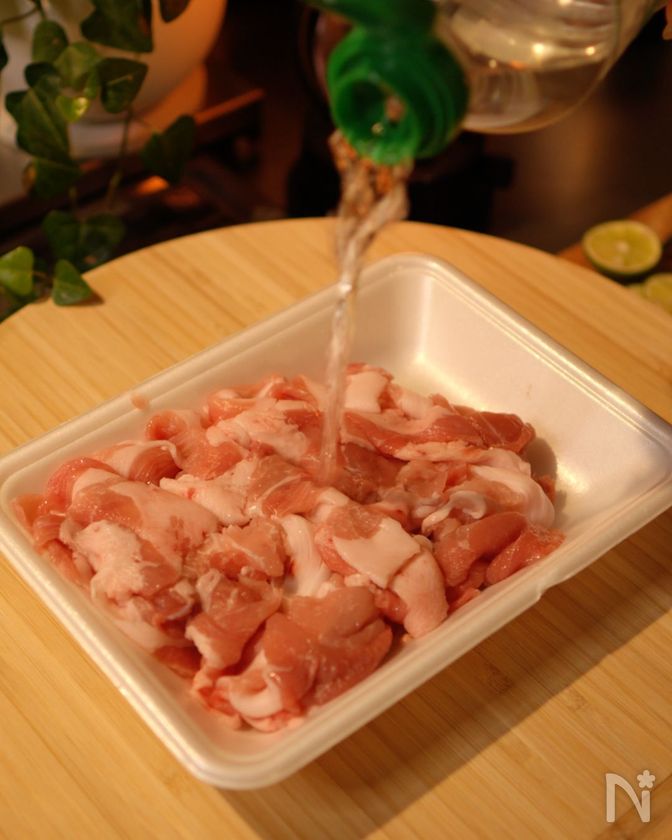 (5) 豚こま切れ肉に【B】の下味をつけ、片栗粉(大さじ1/2)をまぶす。
